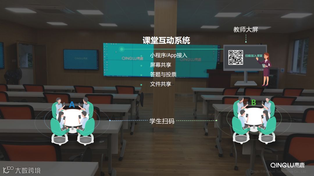 其次,青鹿高校方案支持手机、平板、电脑端(BYOD)接入,其课堂互动系统,支持小程序、APP接入,屏幕共享、答题与投票、文件共享等功能,学生扫码即可进入课堂。