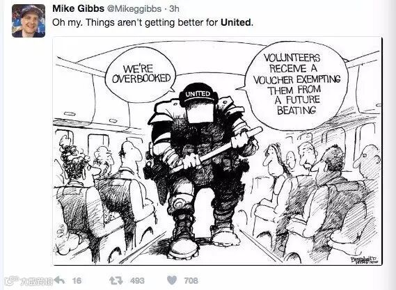 (美国网友恶搞漫画:我们超售了,自愿改签者可收到"免揍券"一张)