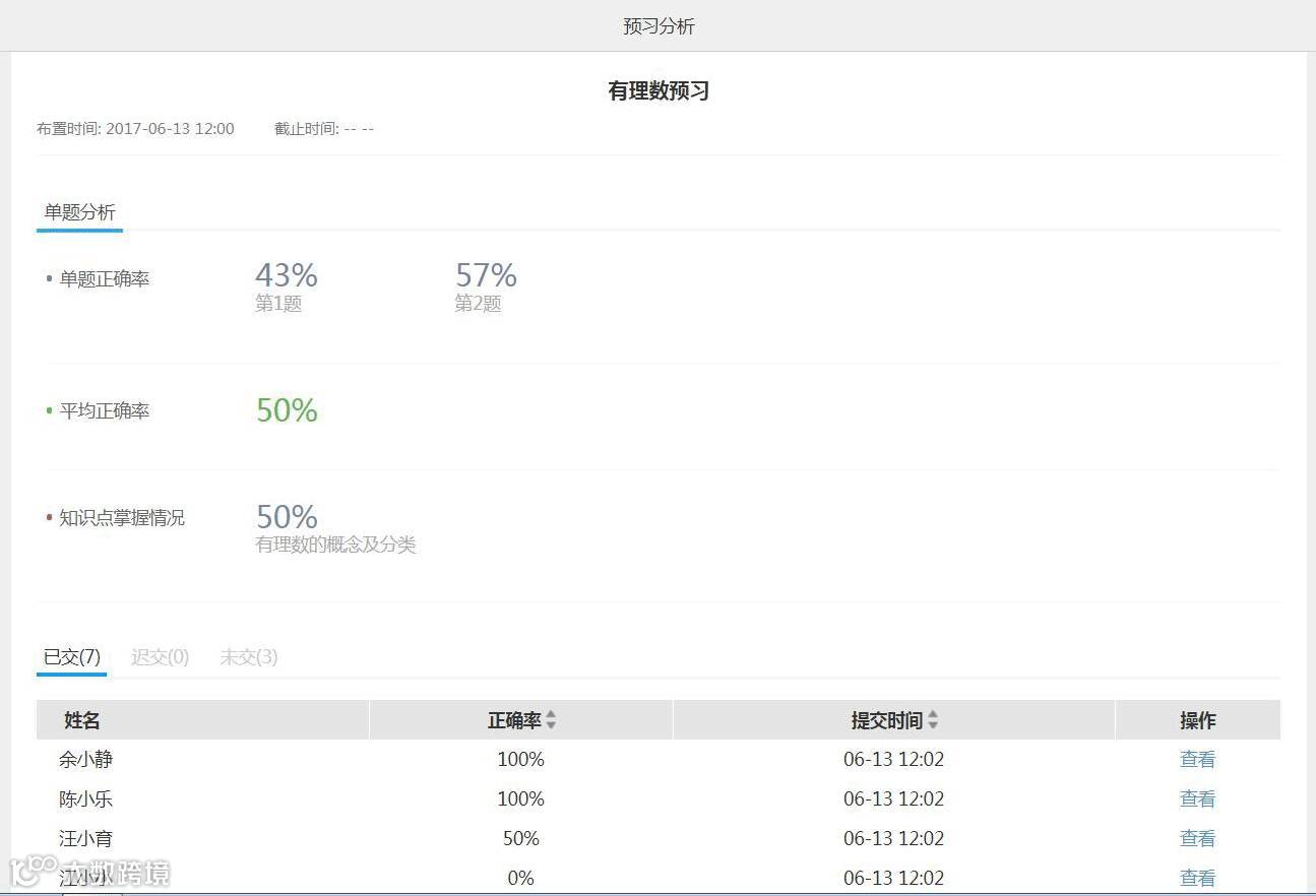 具体来说,课前,老师在青鹿智慧课堂云平台给学生布置预习作业后,可通过提交的结果看到直观分析(见下图),以学促教,确定教学目标、内容、方法等,优化教学方案设计。