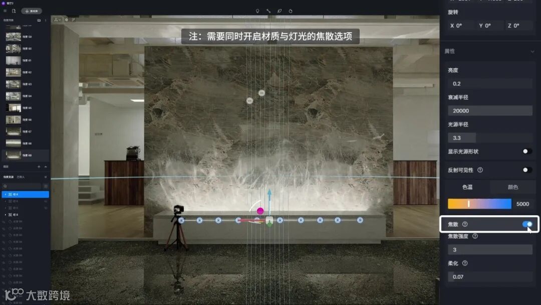 传统复杂的参数,在D5中简化为两个开关,只需同时开启“材质”和“灯光”面板中的“焦散”,即可实时产生真实的焦散效果。