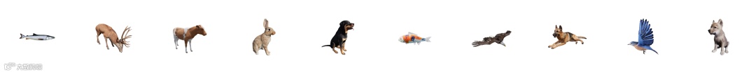猫、狗、鹿、牛、鱼、兔子、鸟、蝴蝶等