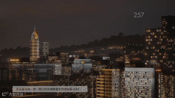 大幅优化了多光源场景的性能,同一视口内,人工光源和自发光源数量最多可达 1024 个。纯光源场景实时流畅度提升1~4倍,视频输出速度提升最多可达90%,超多光源场景不再卡顿。