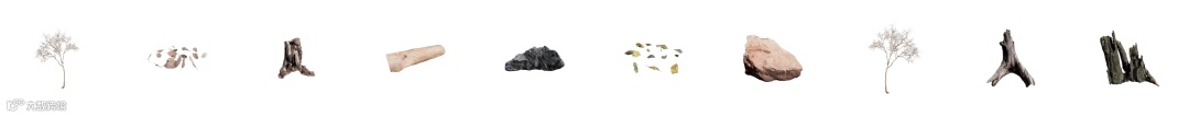 低模树、枯树、岩石、落叶等