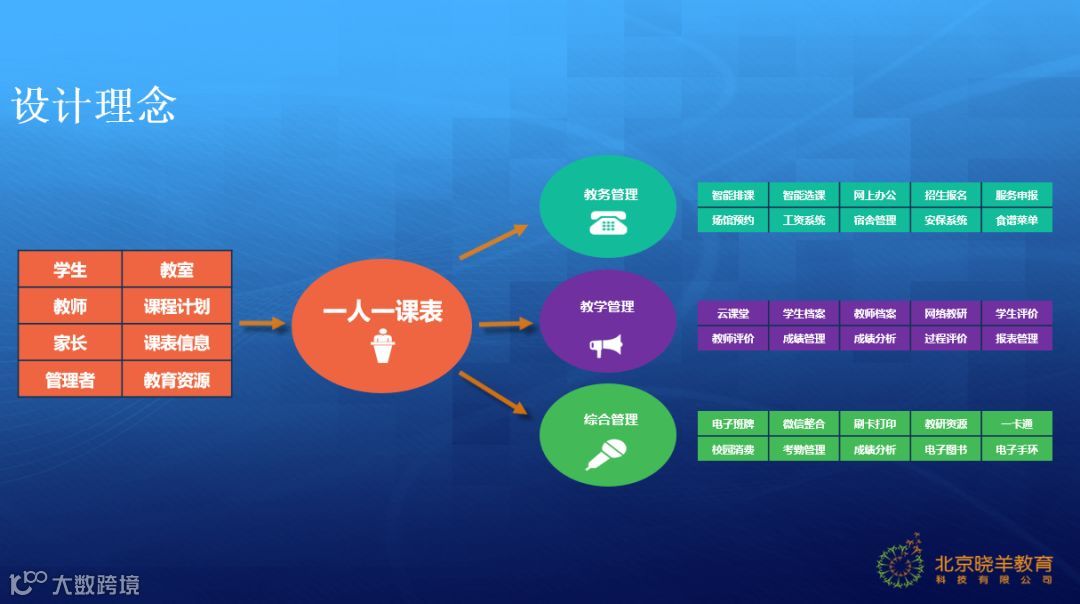 面对变革,晓羊的设计理念是以未来教育理念为引导,以培养学生素养为核心,以创设未来空间、创新未来课程、变革组织结构、完善教育生态为载体,应用大数据、物联网、移动互联网、人工智能等新兴信息技术,实现以学生为中心、促进学生成长、学习方式多样化、个性化的全面发展新样态,提高教育教学质量、提升教育治理水平,促进教育公平优质均衡发展,培养高素质、高能力的21世纪智慧型人才。