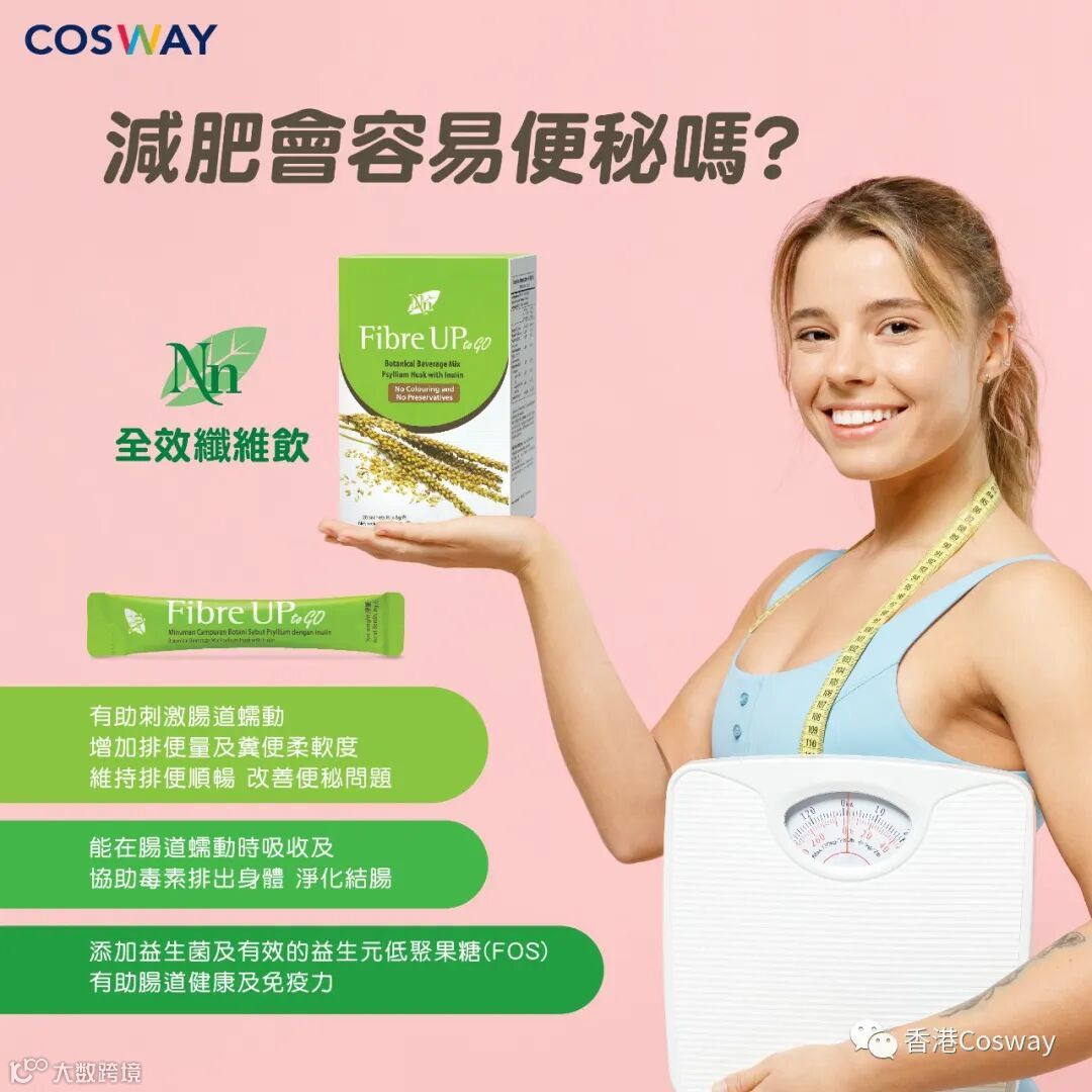 為了在減重時提升飽肚感及降低卡路里攝取,大家會選擇進食大量蔬菜🥬去代替部分肉類和澱粉質攝取。突然的飲食習慣改變及進食大量高纖食物(尤其非水溶性纖維),有機會導致腸道難以適應,並擾亂了正常攝取的纖維比例,有機會產生腸胃不適、肚脹和便秘的情況,結果得不償失。除了蔬菜之外,大家亦可多進食有助軟化大便的水溶性纖維,達致兩種纖維的平衡,令排便更順暢,減少便秘問題。對於習慣速食文化及飲食習慣偏向多肉少菜的香港人,要每天攝取足夠纖維量已經不容易,更何況要同時攝取足夠的非水溶性及水溶性纖維。為此,特別推薦大家COSWAY 的Nn全效纖維飲,助你隨時隨地,快速補充兩種纖維,減肥同時預防便秘。