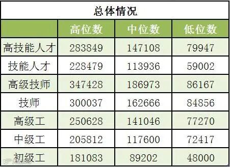 技能人才市场工资价位数据指技能劳动者在2020年取得的全部工资性收入,包括基本工资、奖金、津贴、补贴、加班工资等。将每个技能人才的工资水平从高到低排序,处于90%位置的技能人才工资为高位数,处于50%位置的为中位数,处于10%位置的为低位数。