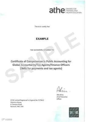由ATHE(AWARDS FOR TRAINING AND HIGHER EDUCATION,译为英国培训与高等教育资质认证或英国培训与高等教育认证)颁发的相应等级薪税师国际证书;
