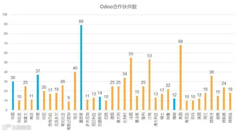 这张图是Odoo合作伙伴在全球的分布数量。我们可以看到在中国只有30个最近增长,但是在墨西哥有89个,在美国有68个,哪怕是阿根廷也有18个,以中国的体量,Odoo的合作伙伴不应该是30个,应该是300个。