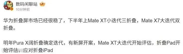 话说回来,爆料还显示,除了Mate X7之外,今年下半年还有一款值得期待的新机型——Mate XTs。