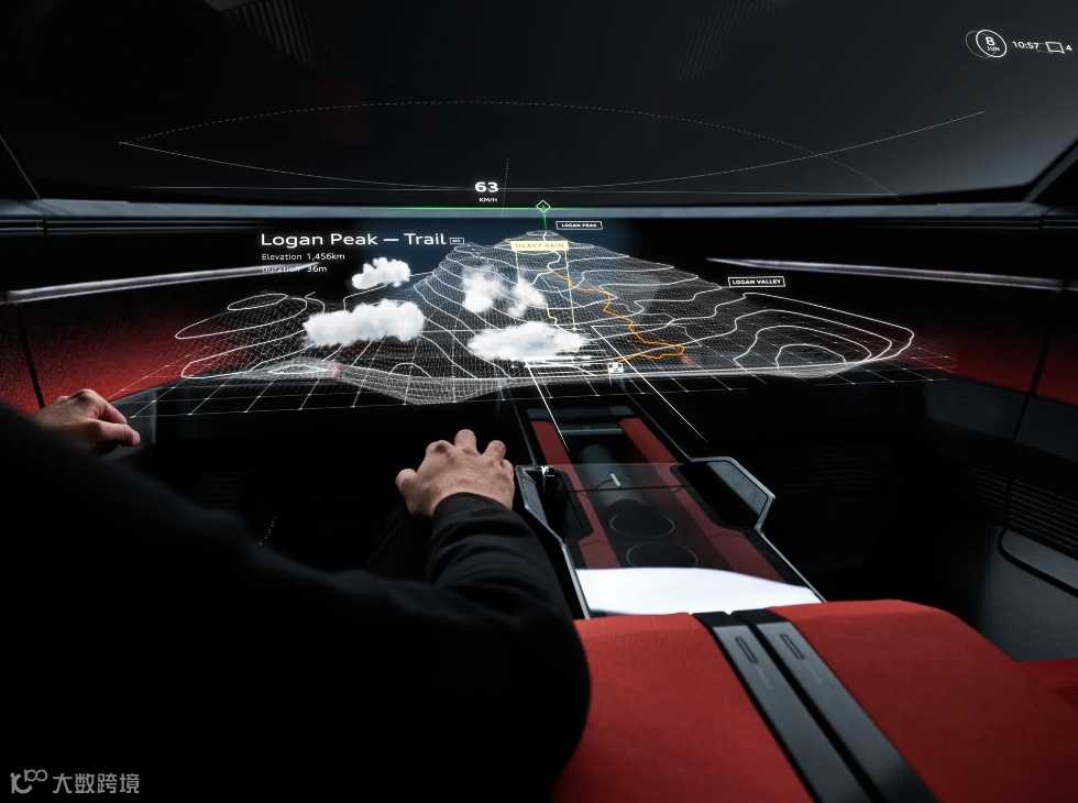 与传统汽车不同的是,车内取消了物理按键以及屏幕按键,运用全新AR/VR 技术,将虚拟内容投射至中控台,包含个性化的影音娱乐以及地图导航、车辆状态等功能。