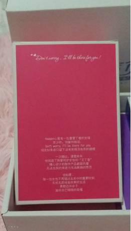 接着是看到摆放整齐的产品,不同规格的产品用了不同颜色的包装盒分开装好,其中日用250mm是红色盒、夜用280mm是蓝色盒、加长夜用400mm是紫色盒。细看每个包装盒,都能发现设计者的贴心之处:在每个盒子的正面都设计了镂空花纹。这样的设计一是增加产品外盒的美观度,二来可以方便使用者在礼盒中拿取使用。且由于礼盒装的产品空间利用率很高,每盒产品的间隙都很狭小,所以有了这个镂空花纹,也方便了拿取。再看包装盒的背面,设计者在每盒背面都加印了挺文艺的一段文字,让使用者有种回归少女心的赶脚哈!不得不说,这款产品的设计者在产品的外包装下了不少心思。产品盒子正面照及背面照如图4、图5所示: