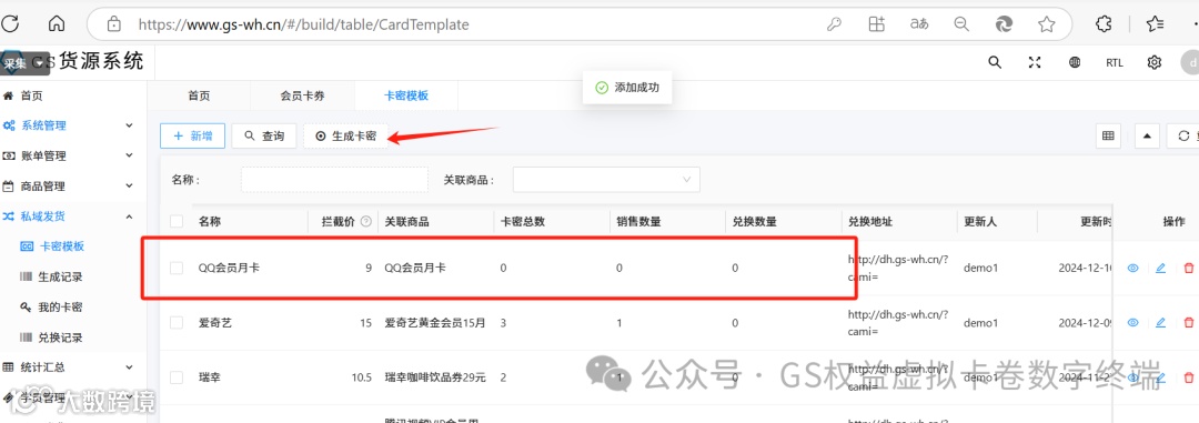 我们打开私域发货菜单,找到卡密模板,点击新增一个QQ会员月卡