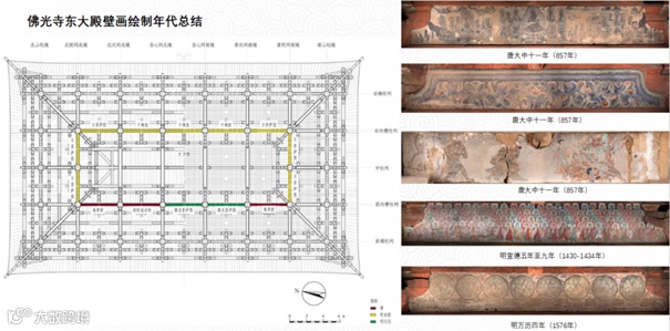 通过文献与宣明历推算,研究团队确定佛光寺东大殿建成年份为唐宣宗大中十一年十月廿日(公元857年11月20日)。监测与考古表明,大殿在元至正十一年(1351)曾大修,将原本内设的板门外移,以适应元代藏传佛教仪轨对空间的需求。明代宣德年间,僧人本随禅师主持复兴,新增千佛、万菩萨壁画与五百罗汉塑像,形成今日殿内的复合空间格局。清代与民国时期主要以修缮与补塑为主,整体延续了明代格局。