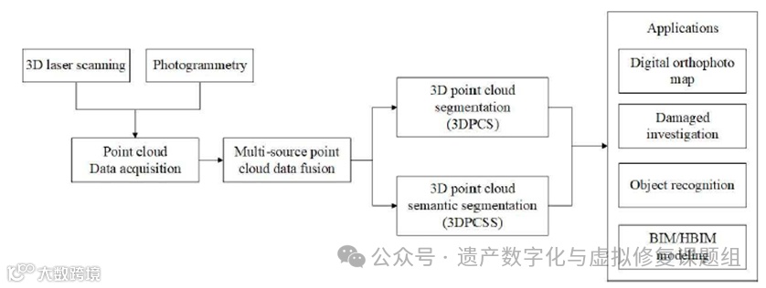 3DPCSS研究案例仍以欧洲历史建筑为主。基于机器学习的3DPCSS已广泛用于室内和室外3D城市场景的语义理解。在文化遗产领域,从导入点云到输出语义标注的基本过程包括四个步骤:(1)点云邻域选择(2)局部特征提取(3)显着特征选择(4)点云监督分类;随着深度学习技术的出现,点云语义分割有了巨大的进步,但仍存在一定局限性。为了构建合适的深度学习模型,前期需要大量的人力资源进行数据标注和模型训练。与城市3D点云场景相比,文化遗产点云标注需要领域知识(对文化遗产场景和结构的正确理解)。