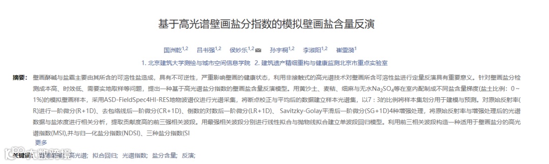 国洲乾,吕书强,侯妙乐等.基于高光谱壁画盐分指数的模拟壁画盐含量反演[J].光谱学与光谱分析,2023,43(10):3272-3279.