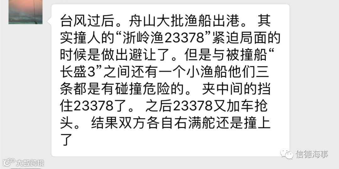 据初步了解,台风过后。舟山大批渔船出港。 其实撞人的“浙岭渔23378”紧迫局面的时候是做出避让了。但是与被撞船“长盛3”之间还有一个小渔船他们三条都是有碰撞危险的。 夹中间的挡住23378了。 之后23378又加车抢头。 结果双方各自右满舵还是撞上。