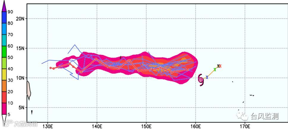 ▲ECMWF集合预报预测的92W未来移动路径概率。