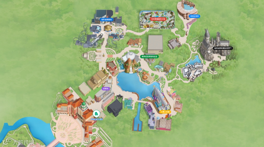 其中,环球主题公园包括了七大主题景区 —— 哈利·波特的魔法世界、侏罗纪世界努布拉岛、变形金刚基地、功夫熊猫盖世之地、小黄人乐园、好莱坞、未来水世界。