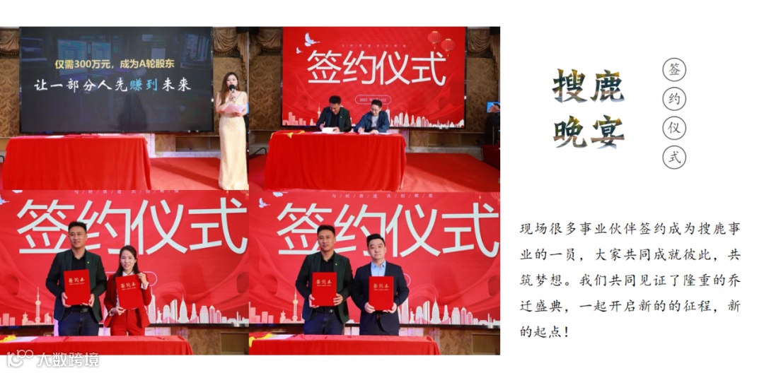 乔迁庆典当天晚上,举办了《新征程·前兔无量》 2023年年会盛典。2023年是充满希望和机遇的一年,也是对于搜鹿、创客极为重要的一年,在2023年年会晚宴上,公司和商业或作伙伴们相互扶持,相互成就,相互陪伴,多位合作伙伴在现场签约成为搜鹿事业的一员,大家共同成就彼此,共筑梦想。我们共同见证了隆重的乔迁盛典,一起开启新的的征程,新的起点!