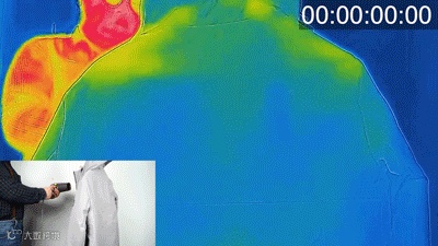按下不起眼的温控按钮,衣服就会迅速加热!在经过加速的热感仪视频里,可以看到不到10秒就已经开始变红了!