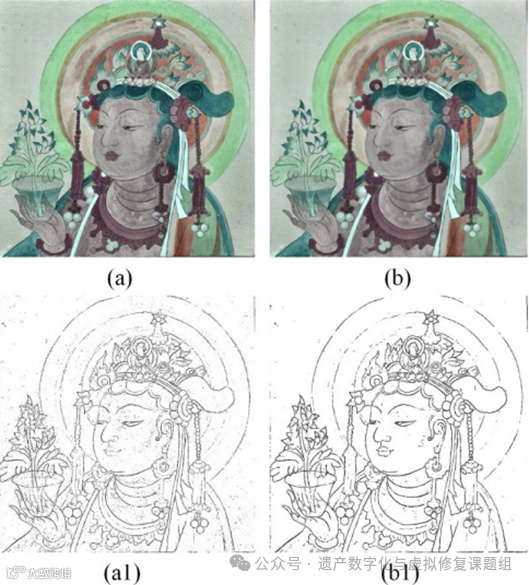 壁画是人类文明的瑰宝,具有极高的艺术价值和历史价值。然而,由于环境的变化和人类的活动,许多壁画遭受了不同程度的破坏,提取线稿对于保存修复这些彩绘文物有着重要意义。壁画的色彩与纹理信息是复杂多样的,它们通常基于线稿。因此,准确定位壁画边缘信息是提取壁画精细线稿的关键。传统的线稿是由画家手工绘制的,这种方法比较复杂,耗时,而且往往缺乏准确性。为了提高线稿提取的准确性,研究人员探索了许多自动提取壁画线稿的方法。目前线稿自动提取方法主要是基于边缘检测的方法,可分为两类:传统的边缘检测算法和深度学习边缘检测方法。而本论文提出了一种提取古代壁画精细线稿的新方法。