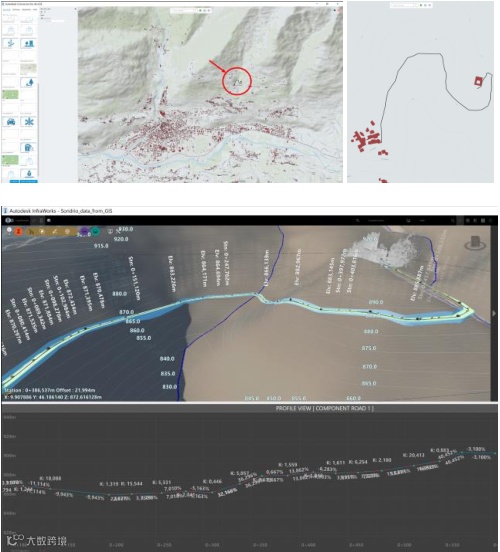 一个例子是重建连接主要道路和Castel Mancapane的山路。路径长约600米,由运动学GNSS测量,获得ArcGIS Online上共享的形状文件,并使用连接器导入InfraWorks(图7)。该线作为街道对象参数化,并覆盖在5 m DEM上。转换为组件道路可实现高级编辑操作。该图还显示了具有相关坡度的垂直纵断面。
