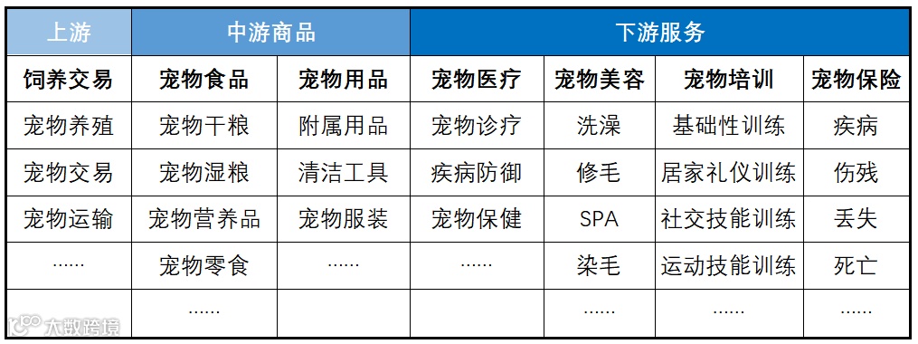 从整个产业链来看,宠物行业最上游的是宠物活体养殖及交易,中游包括宠物食品、宠物用品的生产及销售,下游则是宠物服务,包括宠物医疗、美容、培训等。