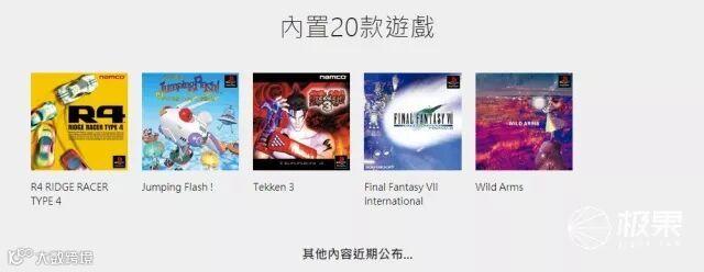 这款复刻主机还会内置 20 款 PS 游戏,目前索尼只公开了其中 5 款,它们分别是《山脊赛车 4》、《Jumping Flash!》、《铁拳 3》、《最终幻想 7 国际版》、和《荒野兵器》。剩余的 15 款游戏则有待公布,毕竟离发售日尚早,索尼也该要慢慢拉起热度才是。