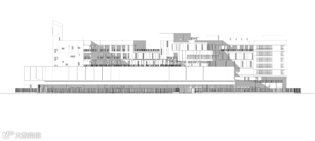 考虑到日后城市肌理东高西低的天际线,我们将田径场靠东布置,将主要建筑体量沿西侧布置,这不仅能减少东侧高层建筑对场地的压迫和局促感,并且操场将获得更多阴影从而更加舒适。位于场地的东北侧的操场下方灰空间则成为家长接送等待区,最大成度的内化和缓解学校为周边道路带来的潜在交通压力。