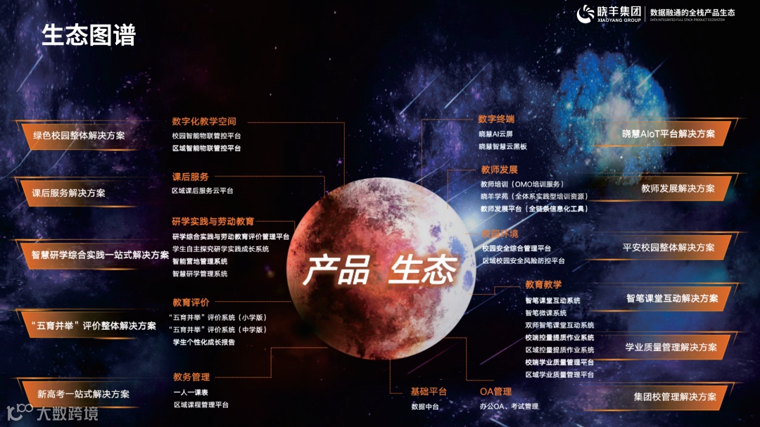 晓羊集团数据融通的全栈产品生态,通过区校融合、业务融合、数据融通与服务融合的四大融合,