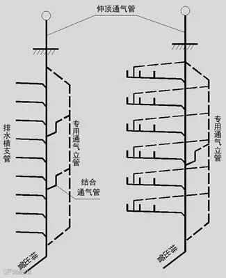 当建筑物层数和卫生器具较多时,因排水量大,空气流动过程宜受排水过程干扰,须将排水管和通气管分开,设专用通气管道。