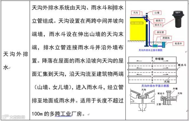 1、外排水:是指屋面不设雨水斗,建筑物内部没有雨水管道的雨水排除方式。按屋面有无天沟,又可以分为檐沟外排水和天沟外排水两种方式。