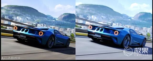 同样的一个赛车高速运动的画面,在不同电视上就会有明显不同的画面表现。(左侧为海信U9,右侧为其它品牌传统液晶电视。)