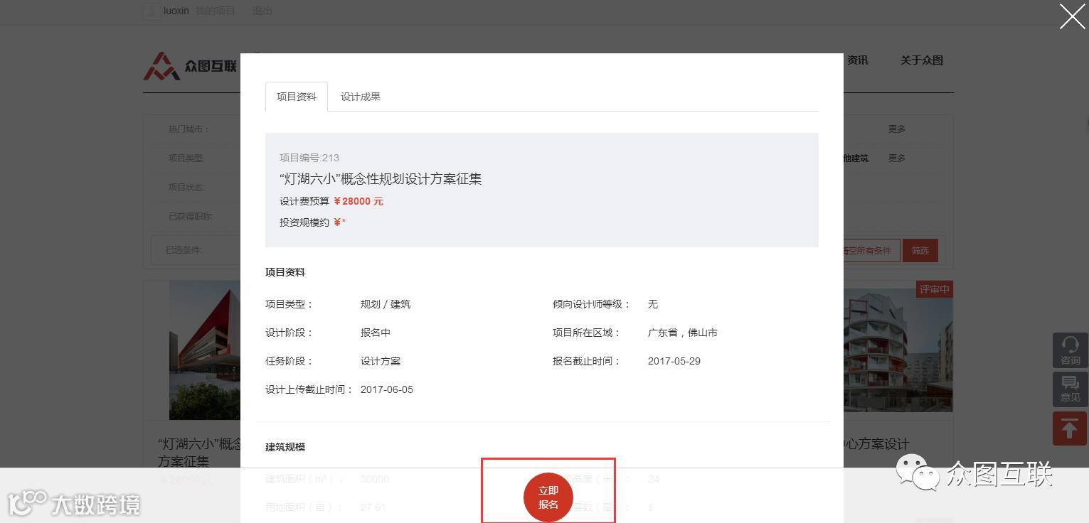 设计师可通过众图互联官方网站,注册成为本网站设计师会员,登陆并填写相应个人信息,即可在“找项目”一栏在该项目页面进行报名参加。