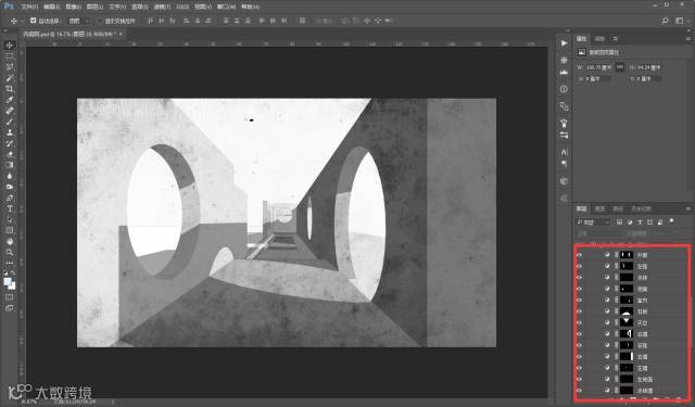 自己把握好光影关系后就可以把阴影关掉了,下面这一步大概是P图最需要时间的一步了,我们需要把这个建筑的明暗面都分别用亮度对比度的蒙版选择出来,通过这个方法我们就可以把建筑的透视感给做出来了,让这张混凝土贴图能更好的融入这个场景当中。