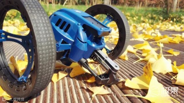 弹跳车的尾部结构是整个产品的精华所在,一根金属杆从其尾部伸出,通过两边的支架弹簧收缩释放张力将机器人推动到半空中完成弹跳动作;触发弹跳功能,内部电机会压缩弹簧进行储能,再通过调整方向实现向前、向上的跳跃。设计还是比较巧妙的。内置的加速度陀螺仪可以让小车实现倒立。支撑杆的末端安装了一个塑胶头,因为在跳跃、行驶过程中经常与地面摩擦会发生破损,产品的配件里面还有两个可以更换的配件。