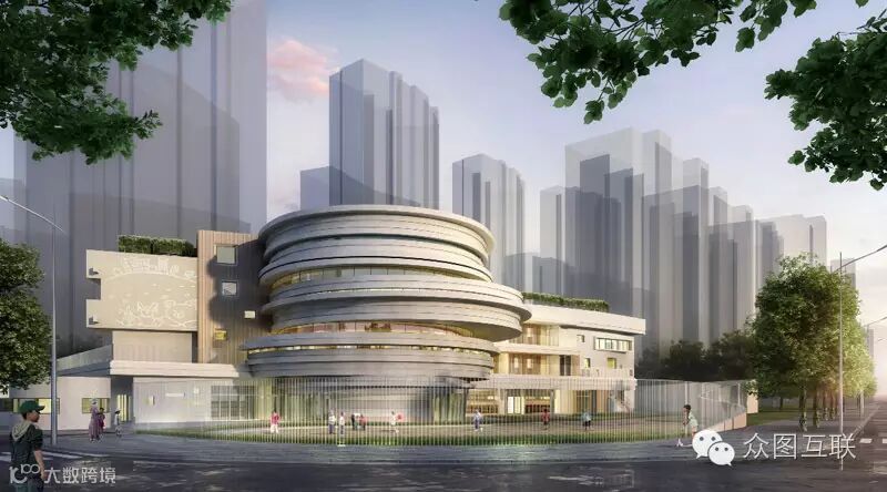 幼儿园在原有建筑框架基础上将入口环形空间以椭圆为单位向各方向悬挑上升。空间内部通过坡道将孩子带入二层,并通过悬挑的椭圆形走廊形成循环的动线。同时在环形动线上开带状窗,将世纪公园内的森林带入环形流动空间。
