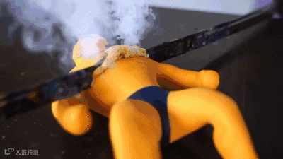 Stretch Armstrong 最终还是被人类的暴力溶解,倒在了液压机下。