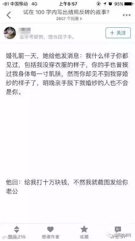 今早第一次对自己的长相感到绝望。要去一个办公大厦拿发票,我一个人等电梯,等电梯到了之后,有一个女士带着耳机慢慢走向电梯,我就按着电梯开门键等她,她进来后,我就问“几楼?”她白了我一眼说:“丑男,离我远一点。”然后自己按了楼层,真的尴尬。