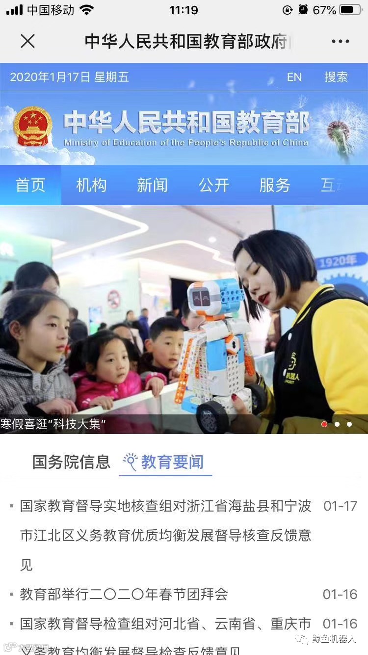 刚刚才发现,今年1月17日,偶们的鲸鱼AI Module积木机器人上了咱中华人民共和国教育部的官网首页。