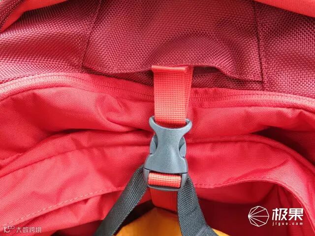 最上方的魔术扣中隐藏着一个卡扣,这个卡扣可将背包等外置背包与登山包绑定在一起,一方面是在行李箱空间使用耗尽之后的额外捆绑方式,另一方面是可以讲其余的行李绑定在行李箱上一起拖动,释放双手、肩膀的压力。