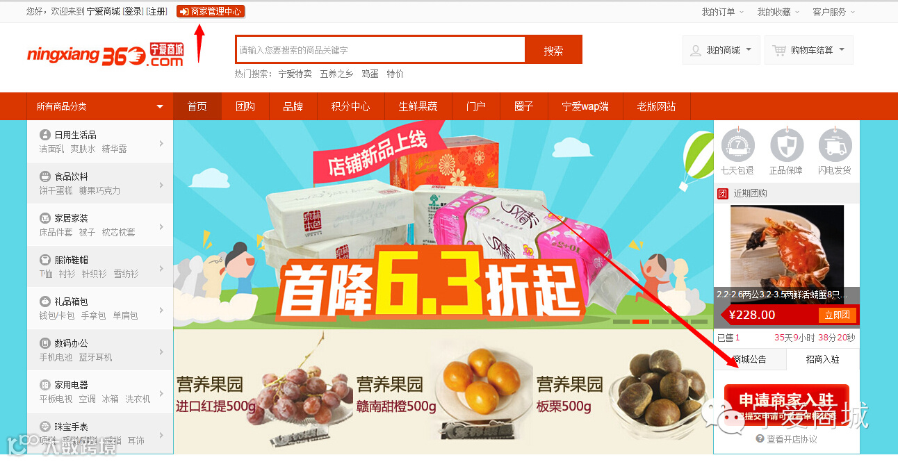 1.在商城首页右侧招商入驻处,点击“申请商家入驻”。登录或注册商城会员后即可申请开店。