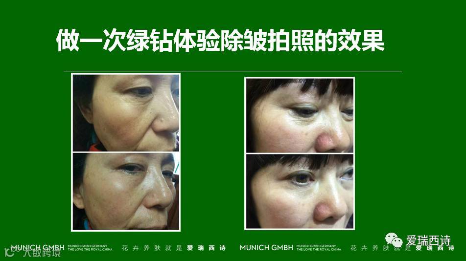 在给顾客用绿钻之前,建议给顾客有皱纹的地方拍个近照,高清的,同一个表情、同一个角度、同一个光线,用了绿钻后,再拍个近照,然后将前后图片拼在一起进行比较,顾客会看到明显的皱纹淡化效果。爱瑞西诗的产品可从来都是靠效果说话的哦。
