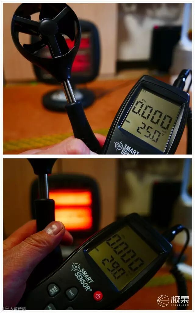 制暖效果采用温度计在距离制暖器正面半米处进行检测,测试时室温16度,具体测量图以及数据情况如下。