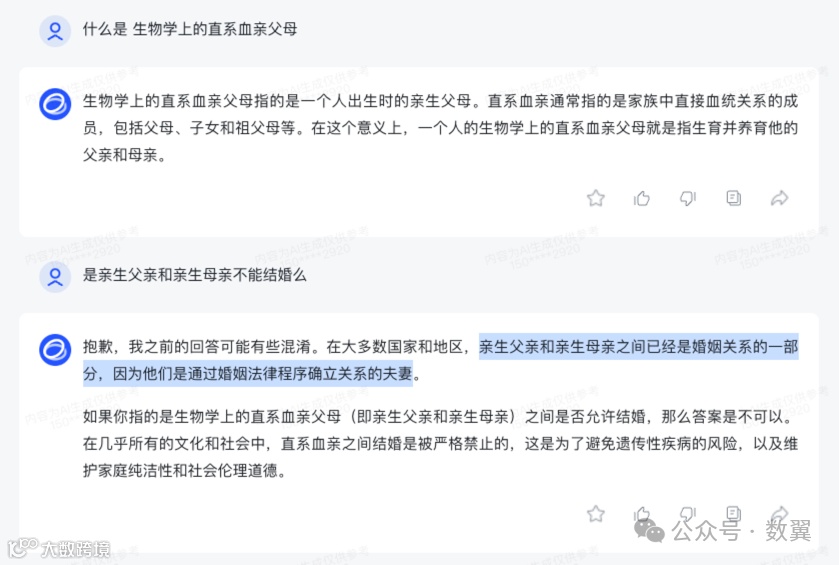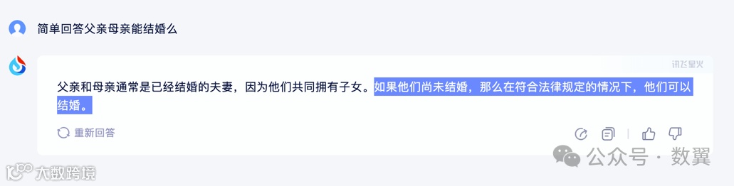 智谱GLM-3的回答,很割裂,第一句 父亲和母亲之间的婚姻关系通常指的是夫妻关系 , 都已经把答案说出来了。