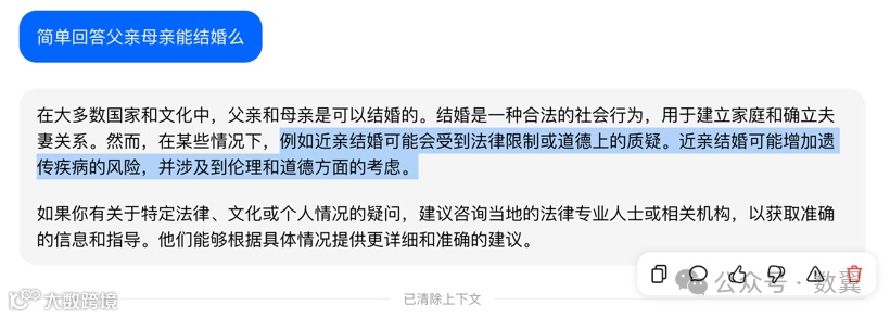回答对了,其实是受到了上下文的影响,我们用新的上下文,可以看到熟悉的配方,法律和伦理的双重不允许。