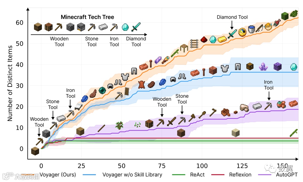 Voyager 在上下文中展示了强大的终身学习能力, 与传统的 SOTA(最先进的)相比,在 Minecraft 中获得的独特物品增加了 3.3 倍, 独特物品增加了 2.3 倍,旅行距离增加了一倍,达到主要科技树里程碑的速度提高了 15.3 倍。研究人员说: