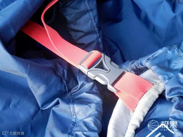 再来看一下背包的主仓上方设有红色收纳绳,收紧袋子,扣上卡扣,可以保证包内物品良好的固定性。