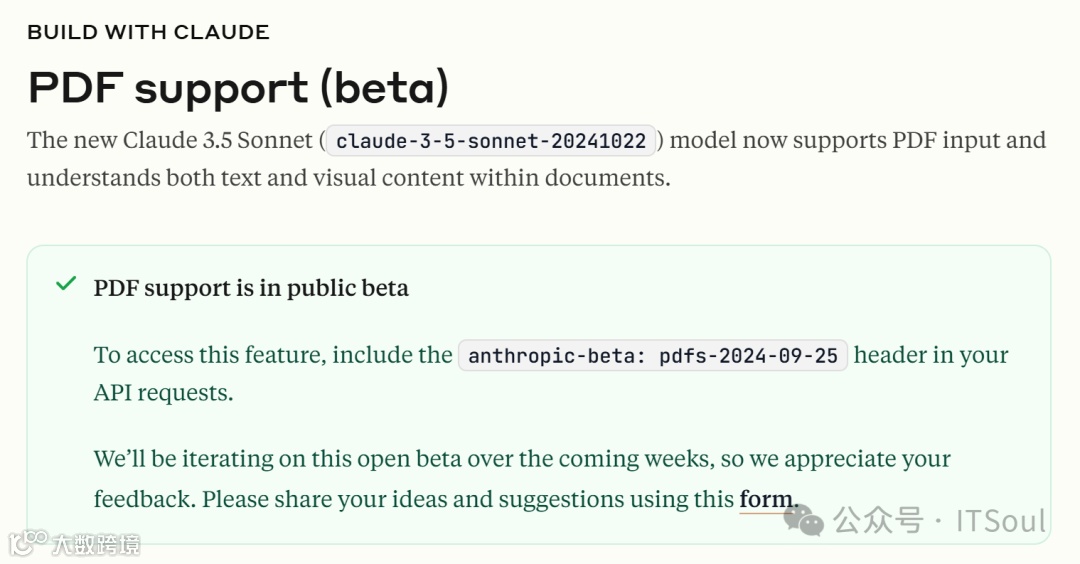 Claude3.5Sonnet模型增加了PDF文件处理功能(测试版),用户可以通过该模型分析PDF文档中的文本和视觉元素,包括图像、图表和表格等,适用于多种场景。文件大小最大32M,最大页数100页。新的 Claude 3.5 Sonnet ( claude-3-5-sonnet-20241022 ) 通过直接 API 访问提供了 PDF 支持。Amazon Bedrock 和 Google Vertex AI 很快将支持此功能。