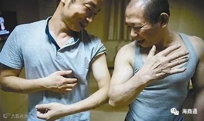 6月20日,在船舱健身房,老轨(船上对轮机长的称呼,左一)和大厨比手臂上的肌肉。